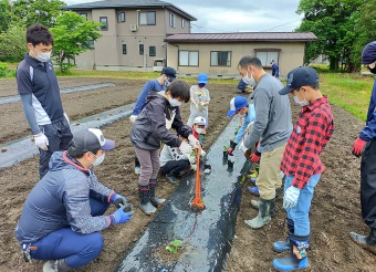 開校式ではそれぞれ元気に自己紹介を行い、その後は「わんぱく農園」に移動して、JA青年部吉島支部(和田悠支部長)のみなさんに指導を受け野菜の種まきや苗の植え付けを体験しました。