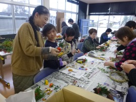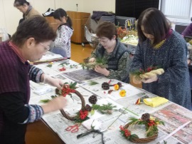 2015年12月17日(木) オリジナルのお正月リースづくりに挑戦! ■期 日:12月17日(火)■場 所:地区交流センター■受講人数:11名■講 師:土屋清子氏(西大塚在住)今年度2回目となった趣味の講座は前回の「クリスマスリースづくり」に続いて「お正月リースづくり」を開催しました。沢山ある材料の中から好きなパーツを選んで組み合わせ、オリジナルのリースを仕上げました。新しい年に思いを馳せながら楽しい時間を共有しました。